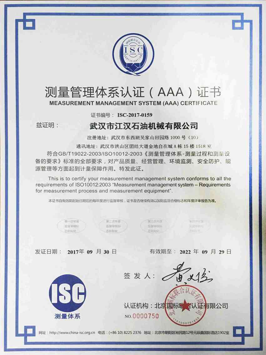 測(cè)量管理體系證書